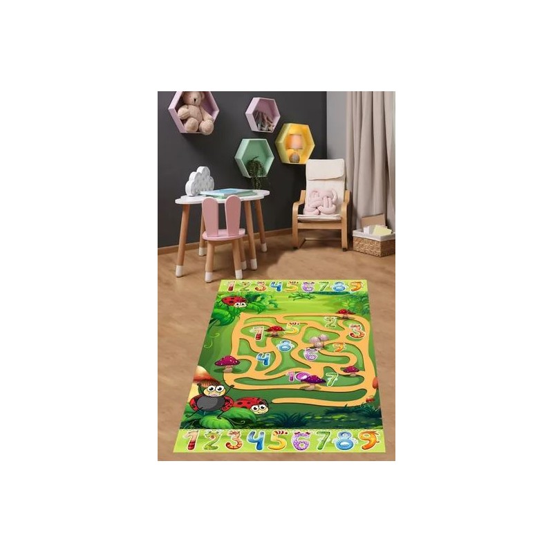 Детският килим е създаден с внимание към детайлите и комфорта. Произведен с помощта на дигитален печат, този килим притежава нехлъзгаща основа и височина на влакната от 10 мм, което гарантира безопасност и удобство при употреба. Килимът е изработен от висококачествен плат, който не задържа петна и не се рони. Лесен за поддръжка, може да се пере в пералня при деликатна програма на 30 градуса, без риск от избледняване, ако се спазват условията за пране. Препоръчва се да не използвате белина и избелващи препарати. Предлага се в различни размери, които могат да бъдат избрани според вашите предпочитания.